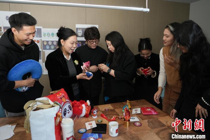 “蛇墩墩”主创设计师林存真(左二)在工作室与学生探讨“蛇墩墩”设计理念。 中新社 记者 熊然 摄
