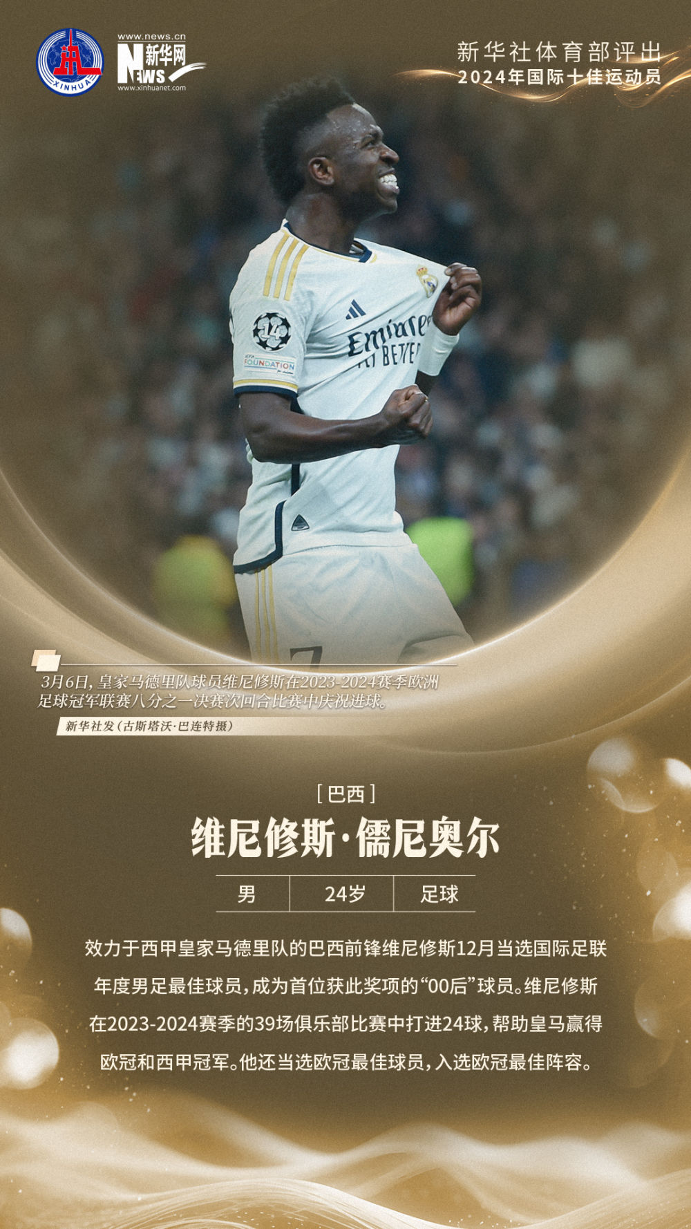 10、维尼修斯·儒尼奥尔(巴西,男,24岁,足球)