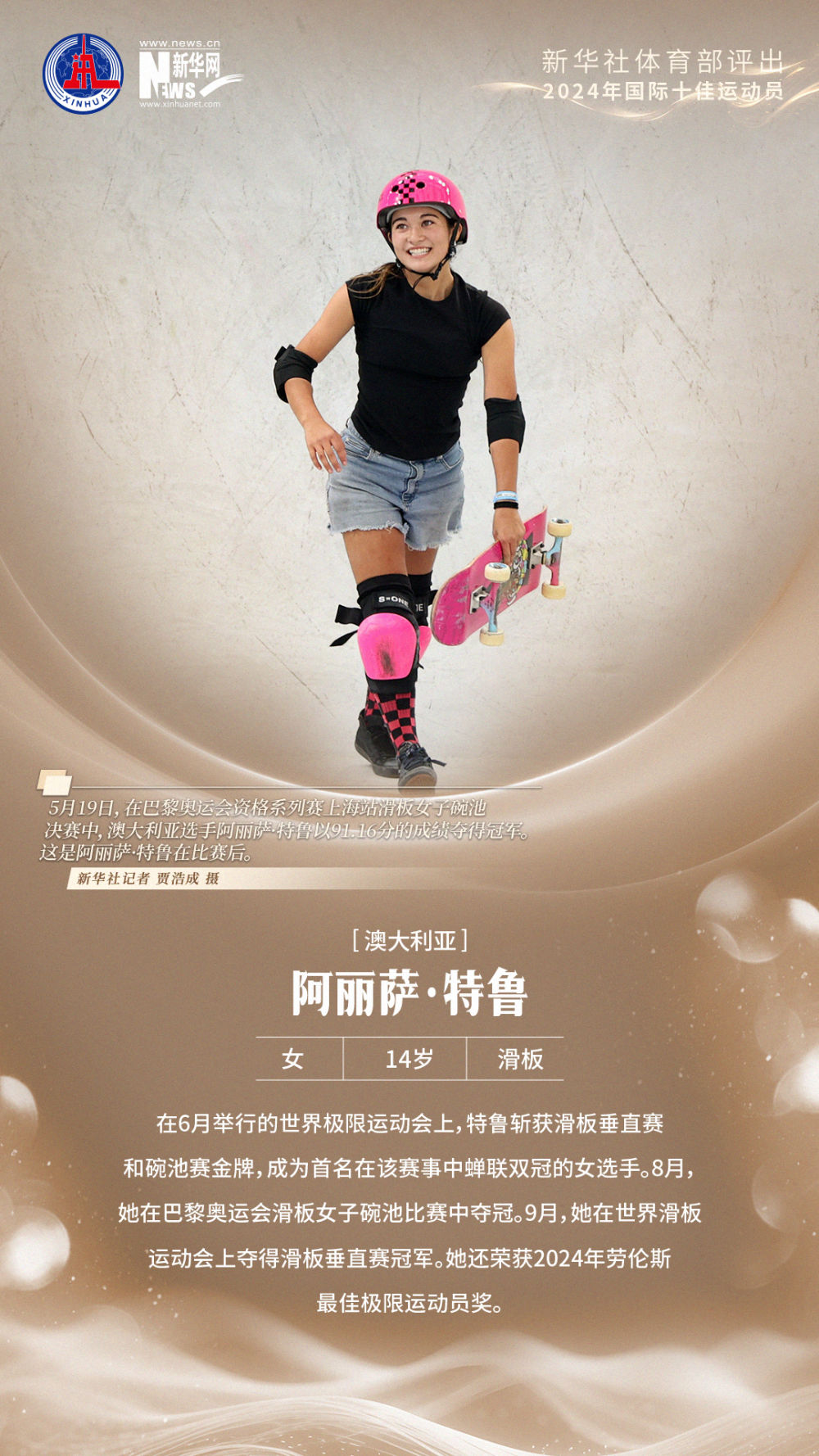5、阿丽萨·特鲁(澳大利亚,女,14岁,滑板)
