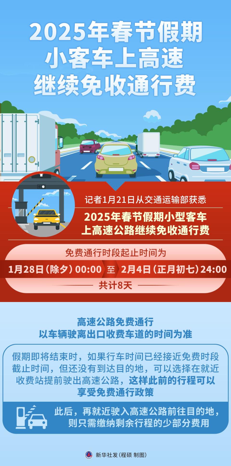 记者1月21日从交通运输部获悉,2025年春节假期小型客车上高速公路继续免收通行费,免费通行时段起止时间为1月28日(除夕)00:00至2月4日(正月初七)24:00,共计8天。