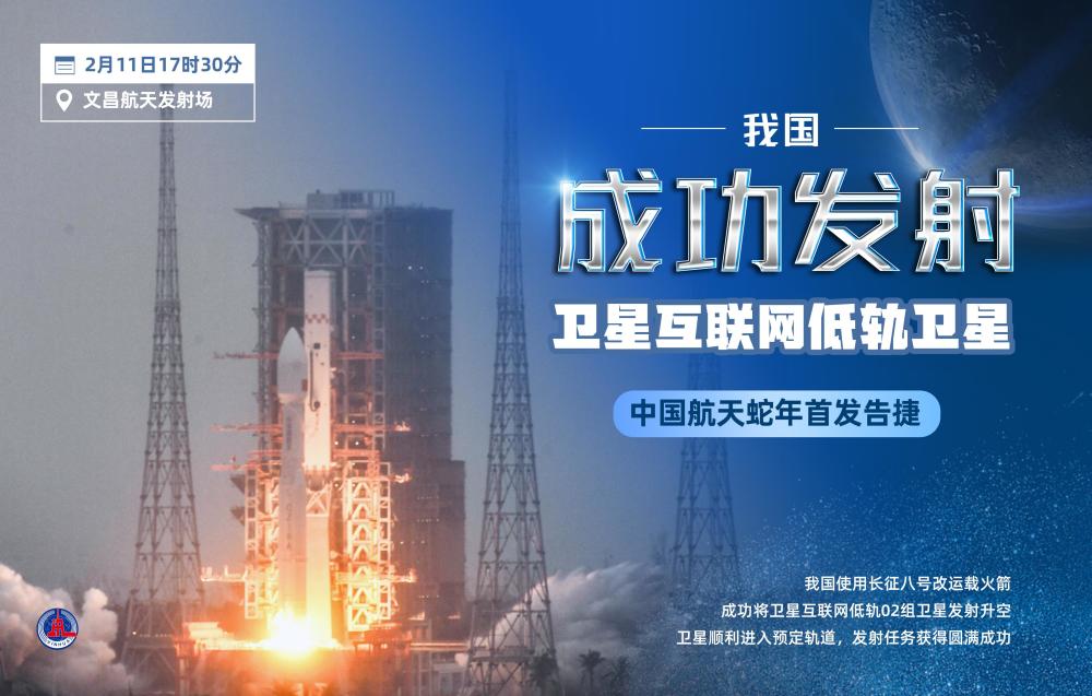 2月11日17时30分,我国在文昌航天发射场使用长征八号改运载火箭,成功将卫星互联网低轨02组卫星发射升空,卫星顺利进入预定轨道,发射任务获得圆满成功。