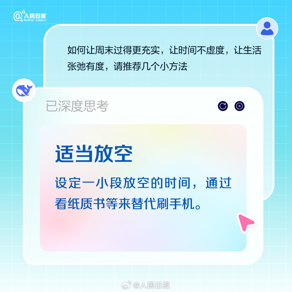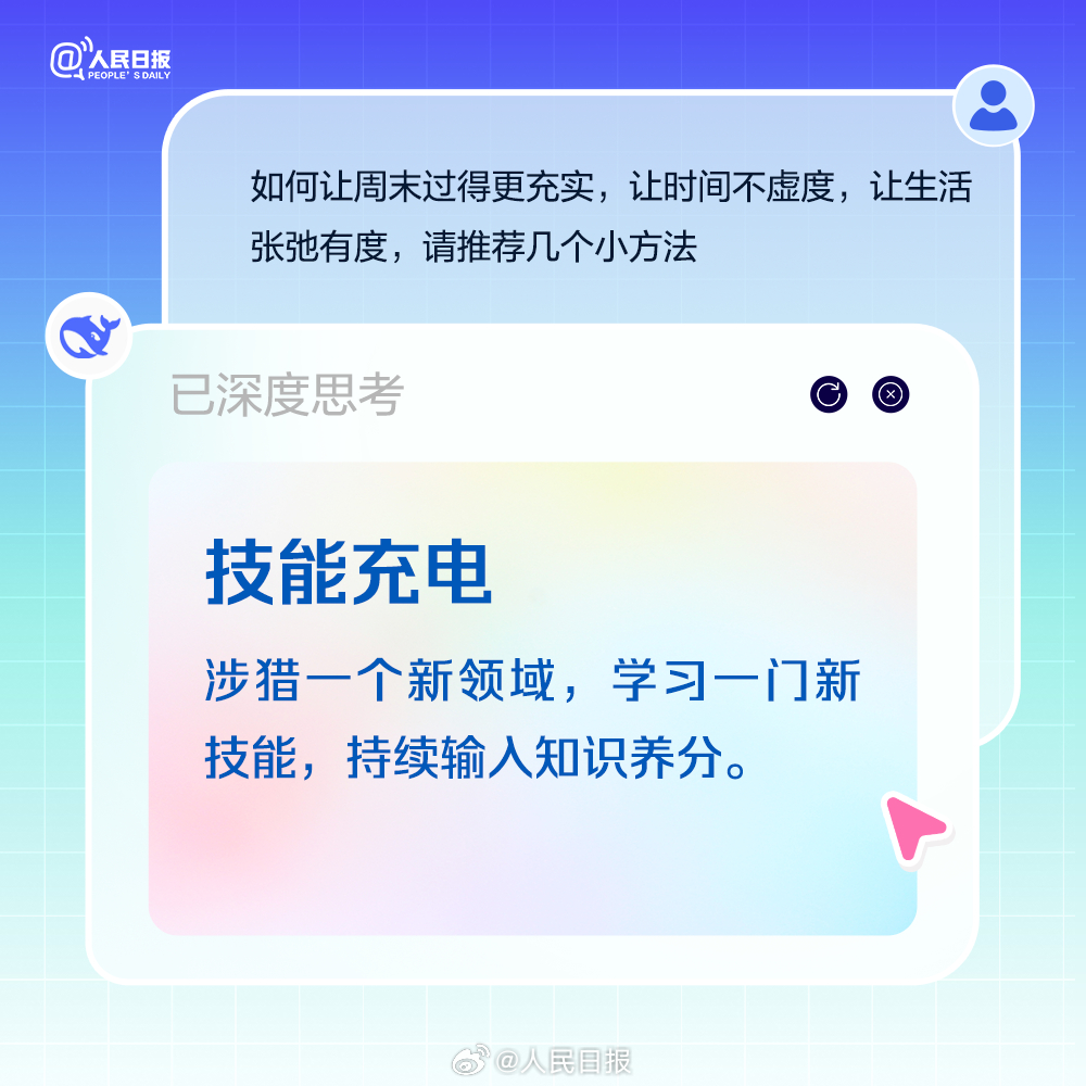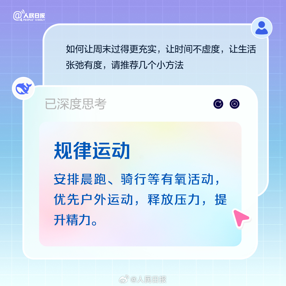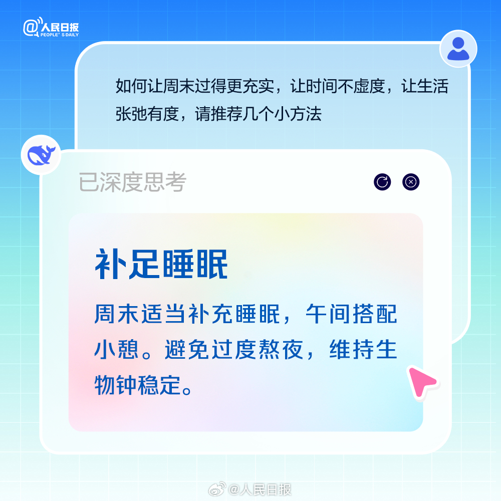 适当补充睡眠,但别一躺就是一整天;积极锻炼,做点有氧运动,多巴胺是快乐开关;尝试解锁隐藏技能,周末也是充电站。最后别忘了,周一前提前规划,做好复盘,让自己元气满满。今日周六,收好AIGC版周末充电攻略。(来源:人民日报微博)