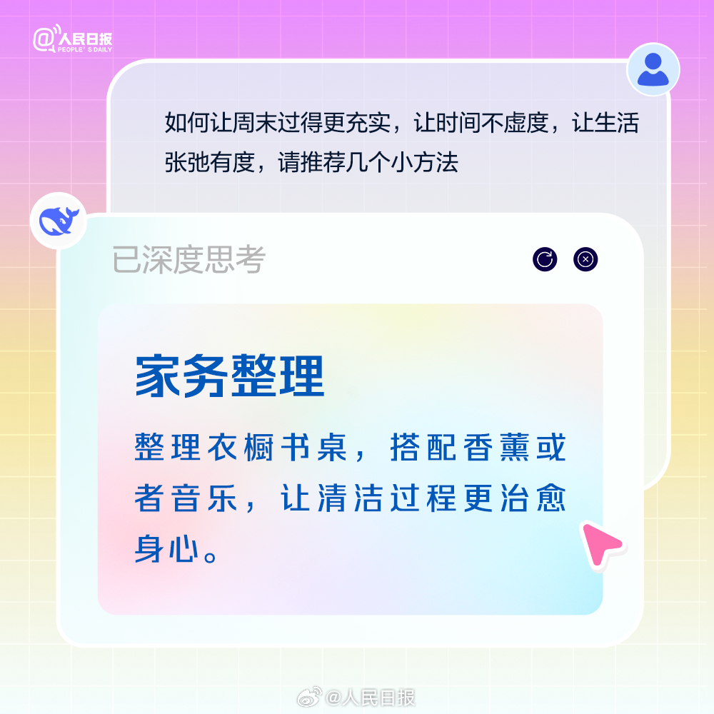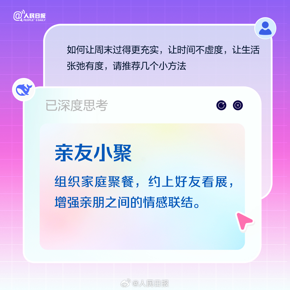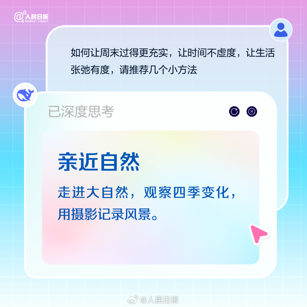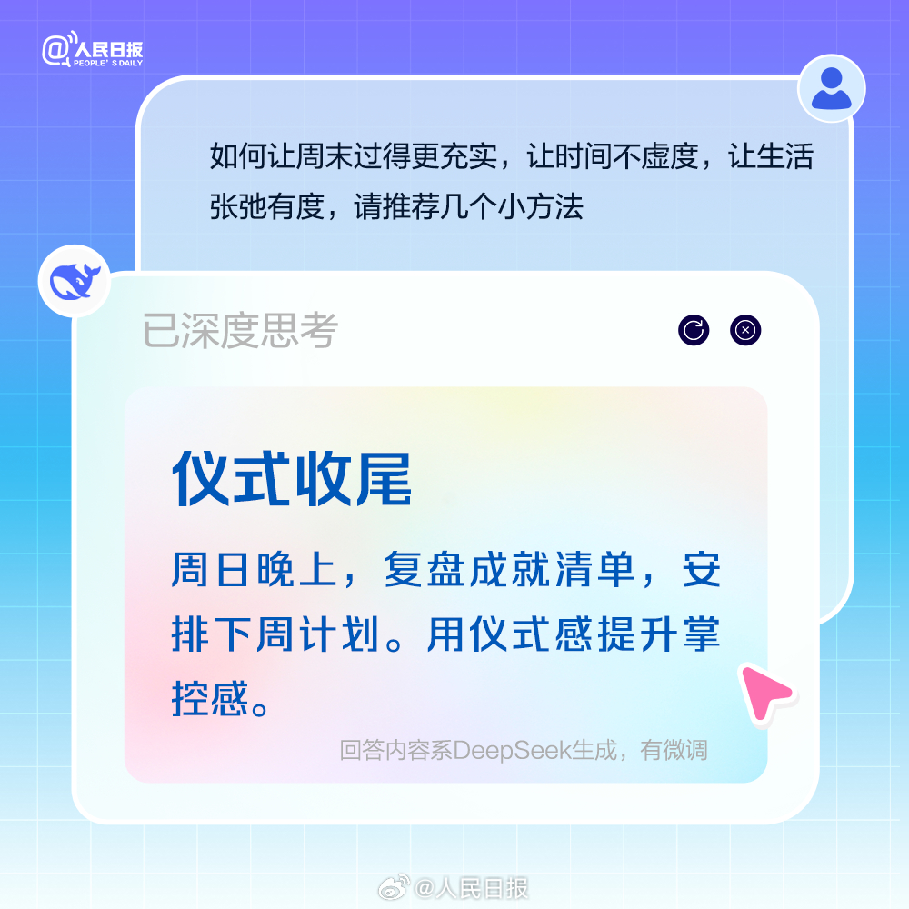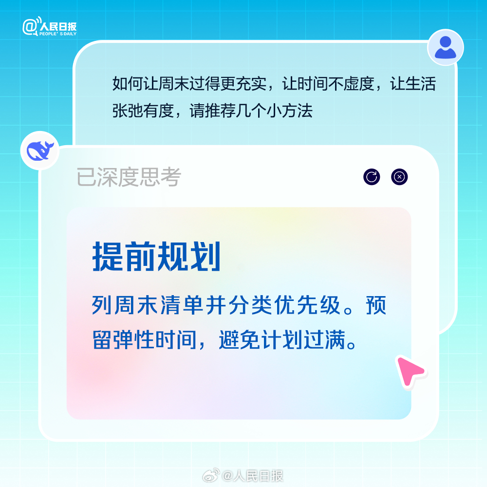 适当补充睡眠,但别一躺就是一整天;积极锻炼,做点有氧运动,多巴胺是快乐开关;尝试解锁隐藏技能,周末也是充电站。最后别忘了,周一前提前规划,做好复盘,让自己元气满满。今日周六,收好AIGC版周末充电攻略。(来源:人民日报微博)