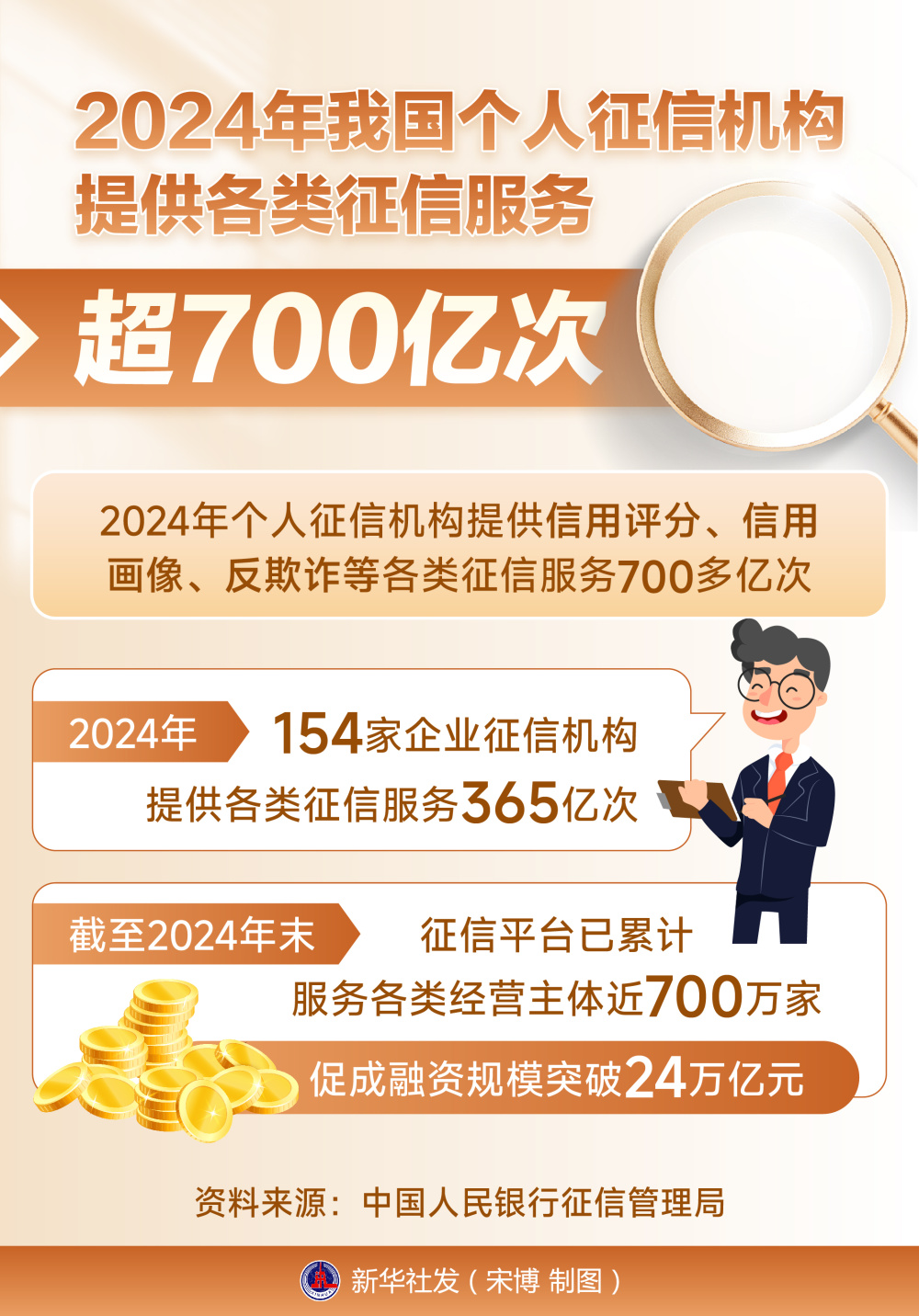 中国人民银行征信管理局局长任咏梅4月2日介绍,我国征信体系建设一直坚持“政府+市场”双轮驱动模式,大力发展多层次征信市场。2024年个人征信机构提供信用评分、信用画像、反欺诈等各类征信服务700多亿次。