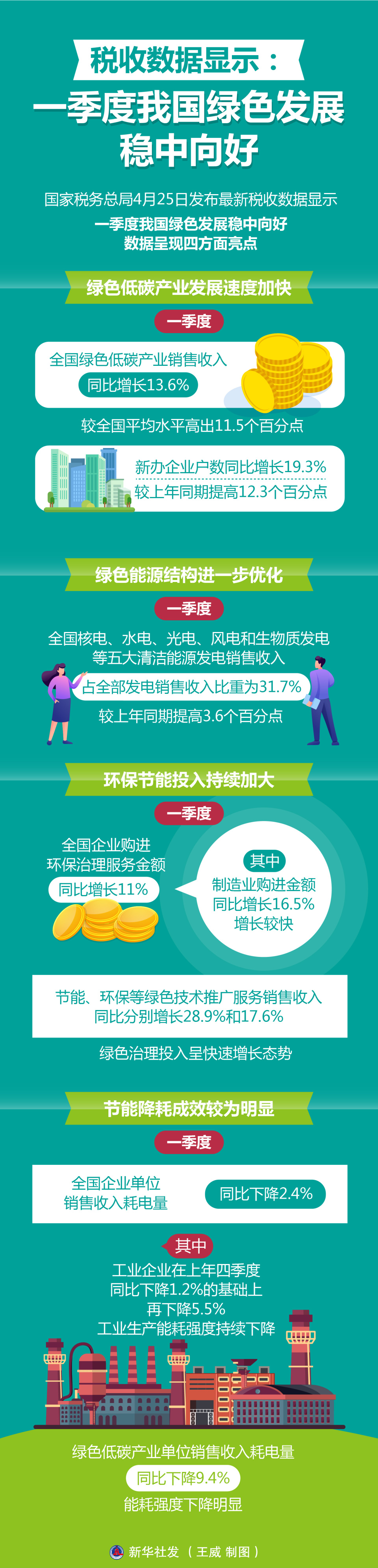 推动经济社会发展绿色化、低碳化是实现高质量发展的关键环节。国家税务总局4月25日发布最新税收数据显示,一季度我国绿色发展稳中向好。