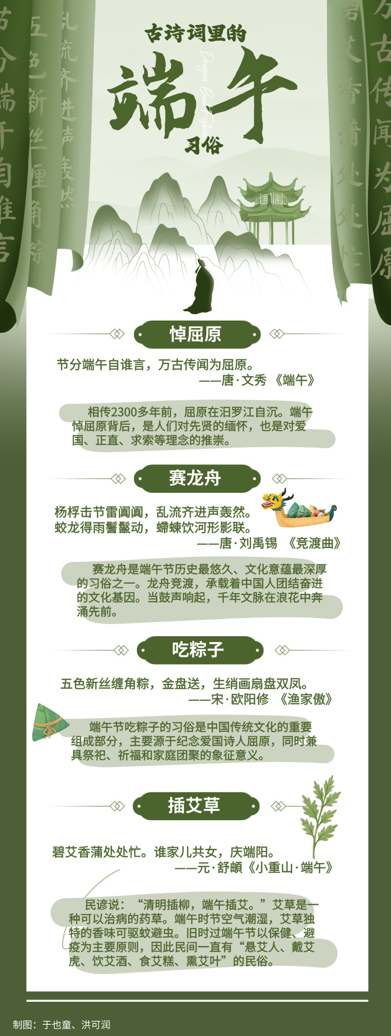 新华社沈阳5月31日电(记者于也童、洪可润)农历五月初五,又到端午佳节。赛龙舟、吃粽子、挂艾草……在流传至今的古诗词中,有许多描写端午习俗的佳句。看图,品读这些诗词,穿越时光,感受古人字里行间的“端午情”。