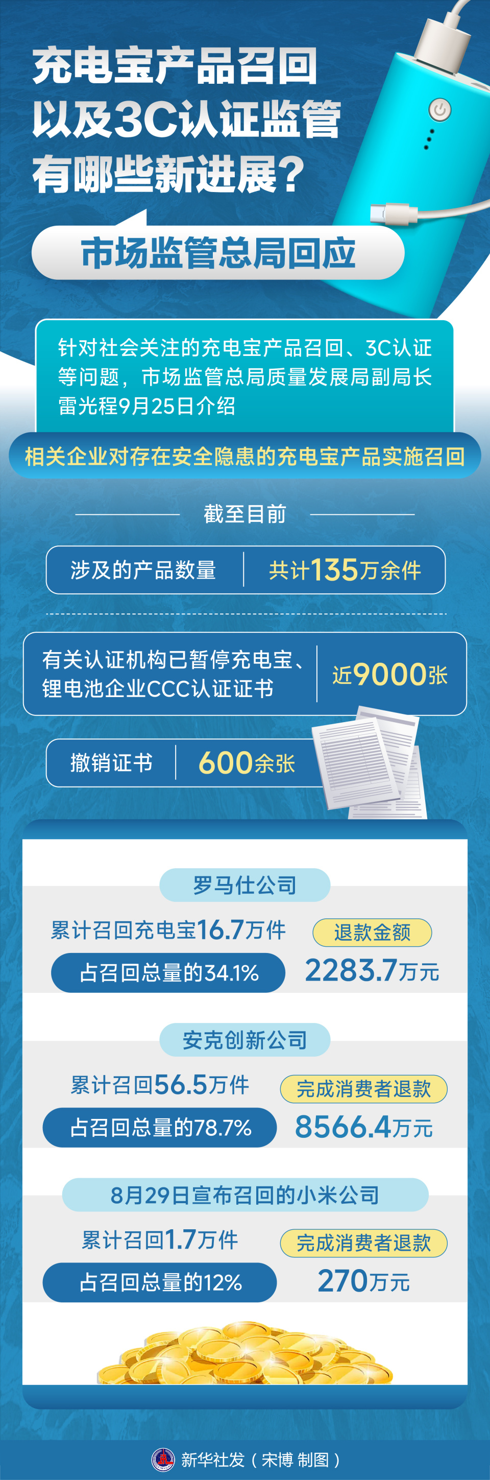 针对社会关注的充电宝产品召回、3C认证等问题,市场监管总局质量发展局副局长雷光程9月25日介绍,相关企业对存在安全隐患的充电宝产品实施召回,截至目前涉及的产品数量共计135万余件;有关认证机构已暂停充电宝、锂电池企业CCC认证证书近9000张,撤销证书600余张。