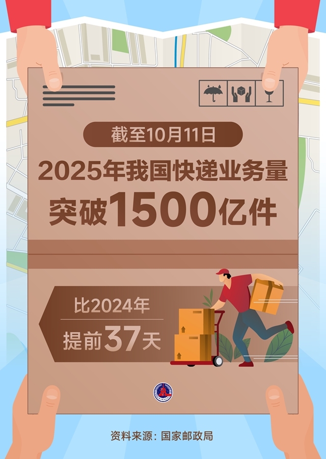 根据国家邮政局监测数据显示,截至10月11日,2025年我国快递业务量突破1500亿件,比2024年提前37天。