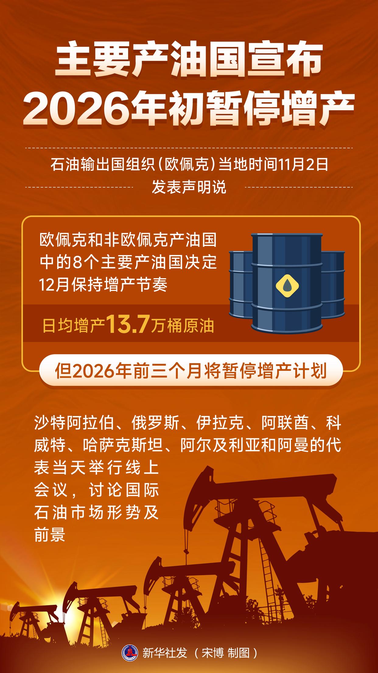 石油输出国组织(欧佩克)当地时间11月2日发表声明说,欧佩克和非欧佩克产油国中的8个主要产油国决定12月保持增产节奏,日均增产13.7万桶原油,但2026年前三个月将暂停增产计划。