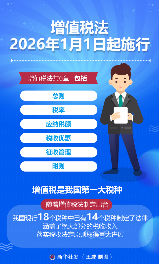 增值税法2026年1月1日起施行。增值税法共6章,包括总则、税率、应纳税额、税收优惠、征收管理、附则。增值税是我国第一大税种,随着增值税法制定出台,我国现行18个税种中已有14个税种制定了法律,涵盖了绝大部分的税收收入,落实税收法定原则取得重大进展。