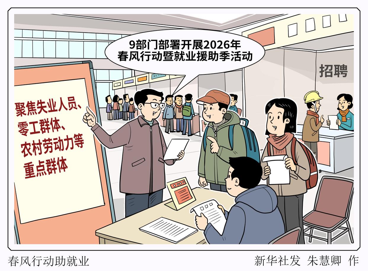 记者1月22日获悉,人力资源社会保障部、交通运输部、农业农村部等9部门于1月至3月在全国范围内部署开展2026年春风行动暨就业援助季活动,聚焦失业人员、零工群体、农村劳动力等重点群体,集中做好困难群体就业兜底帮扶、促进农村劳动力就业增收。