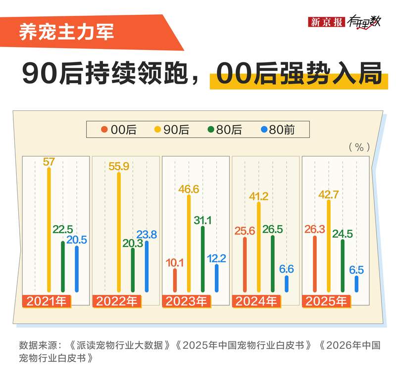 近两年,00后也加入到养宠的队伍中。2025年,90后与00后合计接近七成,成为养宠主力。其中女性占比达63%。