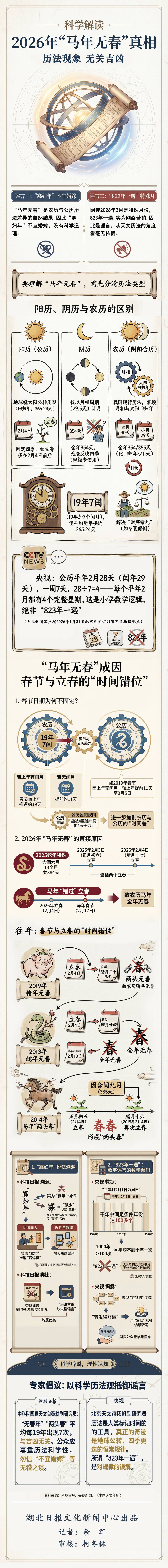 随着马年春节的临近,“2026年马年是无春年,不宜婚嫁”“2026年2月823年一遇特殊月份”“马年是‘寡妇年’等迷信说法在社交媒体交织传播。近日,记者采访相关专家,并结合科技日报、央视新闻、《中国天文年历》等权威媒体报道及历史案例,为您厘清双重谣言的本质——“马年无春”是农历与公历历法差异的自然结果,“823年一遇”系网络炒作,二者均与吉凶祸福无关,希望大家破除迷信。