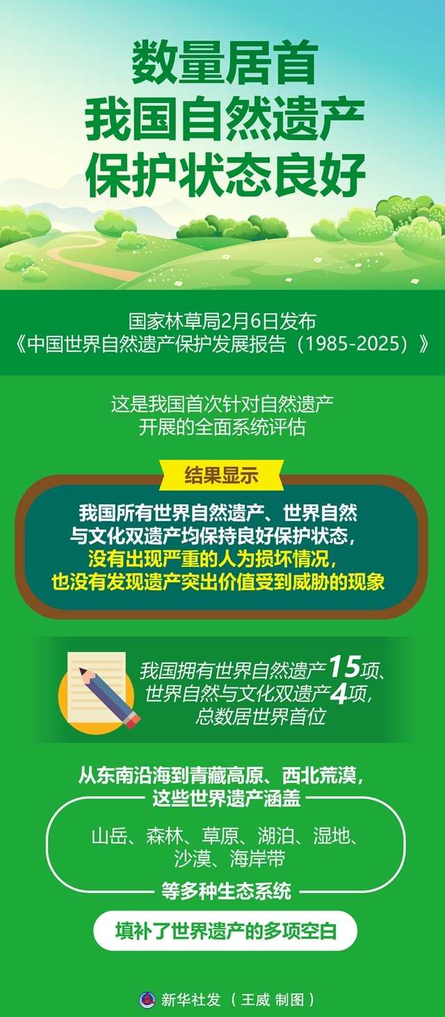 国家林草局2月6日发布《中国世界自然遗产保护发展报告(1985-2025)》,这是我国首次针对自然遗产开展的全面系统评估。结果显示,我国所有世界自然遗产、世界自然与文化双遗产均保持良好保护状态,没有出现严重的人为损坏情况,也没有发现遗产突出价值受到威胁的现象。