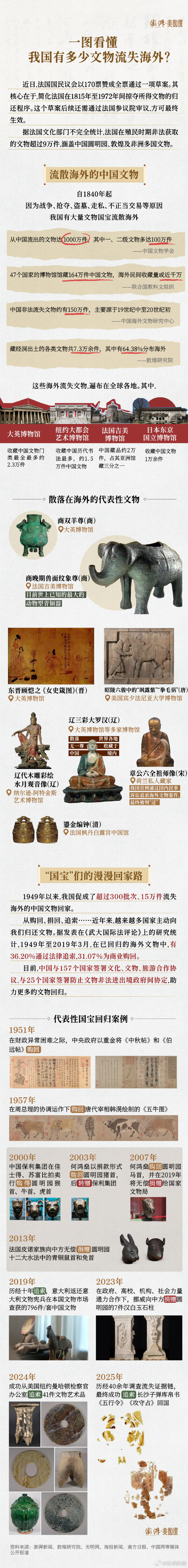 自1949年以来,我国通过购买、捐赠、追索等方式让超过300批次、15万件文物得以回家。但与之相比,我国仍有无数国宝漂泊海外。