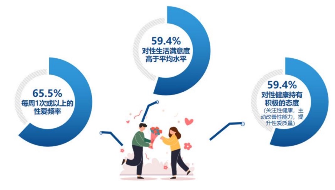 性生活质量同时受到身体损耗、精神压力、心理状态与经济条件等诸多客观因素影响。《蓝皮书》援引的一组中康科技CMH调研数据显示,“恋爱一族(注:调研中25-35岁恋爱中的男性群体)”中有65.5%的人表示每周有1次或以上的性生活频率,59.4%对性生活满意度高于平均水平,但仍有较大提升空间;而在“有家一族(注:调研中已婚已孕的男性群体)”中,93.8%的人重视性健康,72.9%认为性生活会影响和谐的家庭关系。而在“上班一族”中,有51.2%的人表示存在较多健康困扰,同时对性健康态度较为消极,44.0%对性生活满意度低于平均水平。