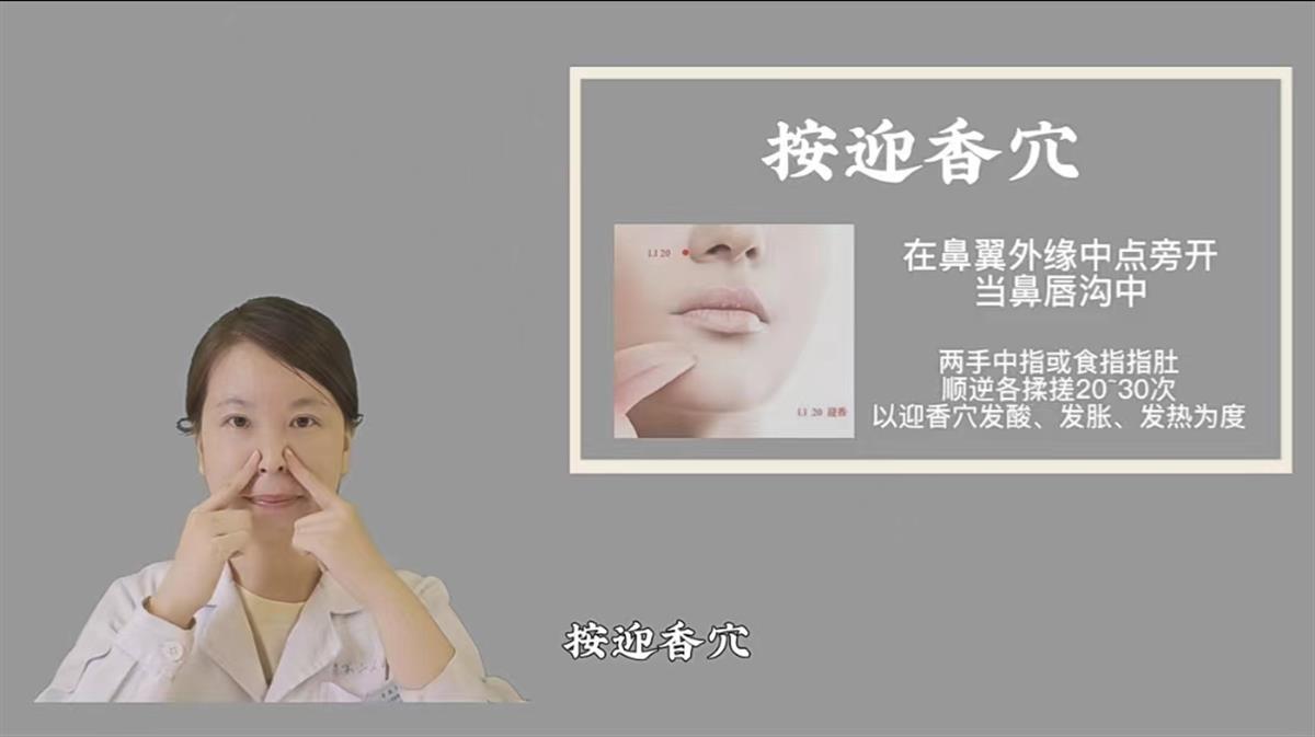 二是按迎香穴润肺防燥。冬燥容易危害肺脏。点揉迎香穴具有清热散风、祛燥润肺、宣通鼻窍的作用;迎香穴位于鼻翼外缘约0.5寸、鼻唇沟中。两手中指或食指指肚,顺逆各揉搓20~30次,以迎香穴发酸、发胀、发热为度。