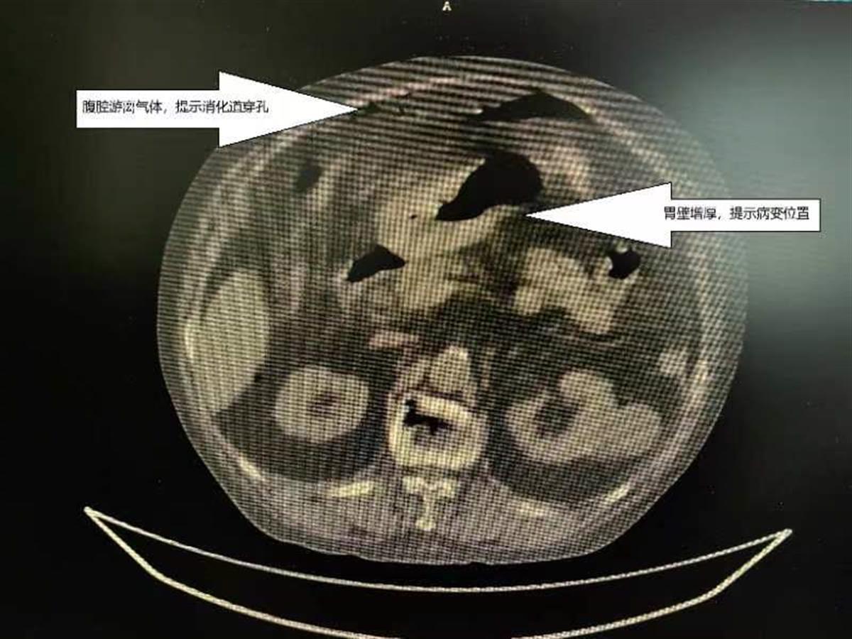影像学检查发现刘爷爷有胃穿孔,和服用过量含糖皮质激素药物有关(通讯员供图)