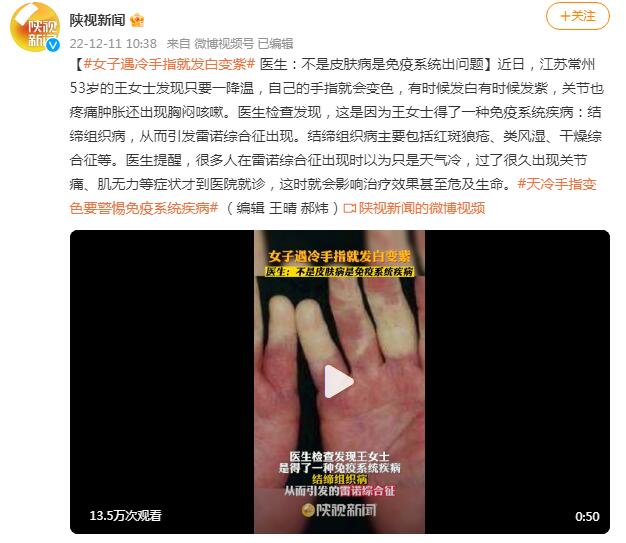 近日,江苏常州53岁的王女士发现只要一降温,自己的手指就会变色,有时候发白有时候发紫,关节也疼痛肿胀还出现胸闷咳嗽。医生检查发现,这是因为王女士得了一种免疫系统疾病:结缔组织病,从而引发雷诺综合征出现。结缔组织病主要包括红斑狼疮、类风湿、干燥综合征等。医生提醒,很多人在雷诺综合征出现时以为只是天气冷,过了很久出现关节痛、肌无力等症状才到医院就诊,这时就会影响治疗效果甚至危及生命。