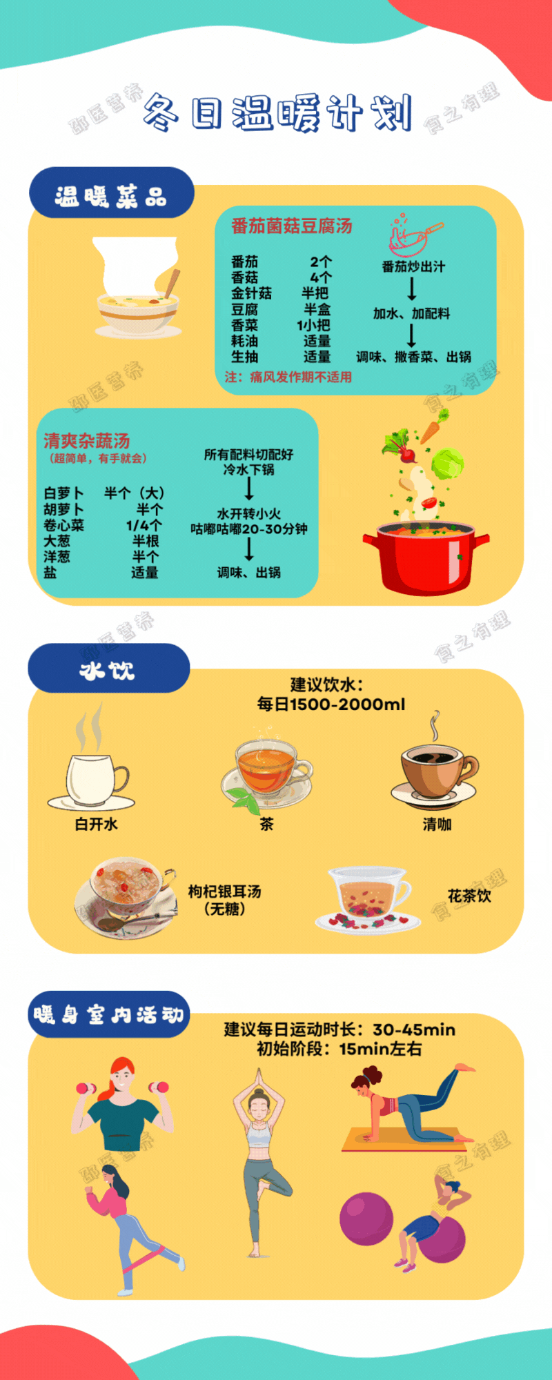 可以在冬季食谱中加入温暖、健康的蔬菜汤、炖菜等食物;另外可以经常喝温热茶水,持续温暖身体。