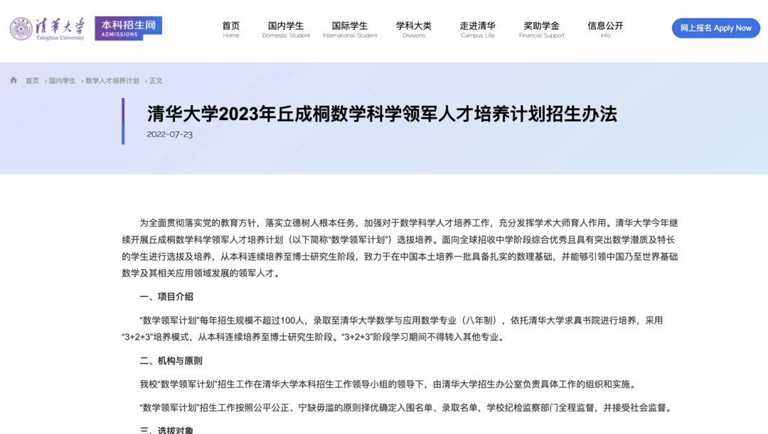 根据清华大学求真书院官网介绍,“丘成桐数学领军人才培养计划”面向全球,对具有突出数学潜质及特长的学生进行选拔及培养,每年拟招生规模不超过100人,采用从本科贯通培养至博士的“3+2+3模式”,致力于培养未来数学及相关领域的领军人才。2021年,丘成桐数学领军计划首届录取69人。
