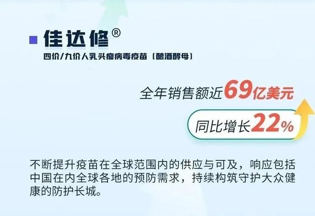 2月7日,默沙东中国在其官方微信号发布了2022年全年财报,数据显示,公司营收593亿美元,同比增长22%。净利润145.19亿美元,同比增长18%。其中,默沙东的四价/九价人乳头瘤病毒疫苗(酿酒酵母)(商品名:佳达修)全年销售近69亿美元,同比增长22%。此前,国内默沙东HPV疫苗独家代理商智飞生物(300122.SZ)也公告了与默沙东的疫苗产品续签落地,协议期限至2026年12月31日。续签落地后,智飞生物大幅增加对HPV疫苗的采购金额至979.57亿元,相关公告数据显示,上一轮协议采购金额为281.06亿元。