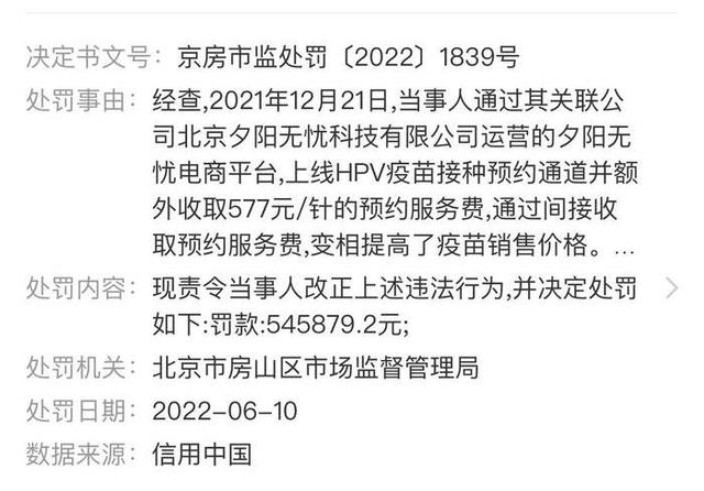 根据天眼查显示,北京今康中医医院曾因违反价格法,被北京市房山区市场监督管理局罚款54.58万元。处罚事由显示,当事人通过其关联公司运营的夕阳无忧电商平台,上线HPV疫苗接种预约通道并额外收取577元/针的预约服务费,变相提高疫苗销售价格。其中,九价包三针套餐每份超出政府指导价1631元。经计算,截至案发前,当事人采购四种HPV疫苗共计5124支,且未执行政府指导价销售HPV疫苗直接获益54.58万元。截至案件调查终结,多收价款已退还消费者。