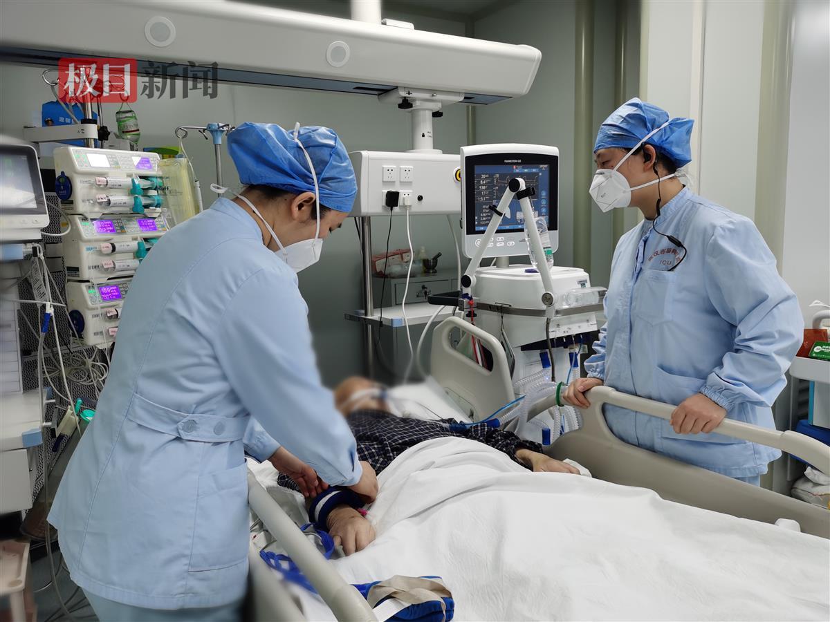 护士长钟小锋等正在为撤下ECMO的患者进行护理