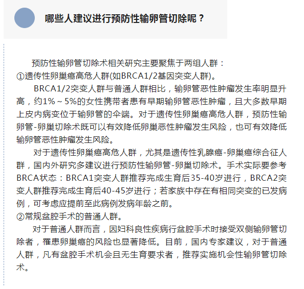 在临床实践中,越来越多妇科良性疾病手术时实施双输卵管切除术。患者常有疑问,我的输卵管没有问题,为什么要切除?今天我们就来看一看但预防性输卵管切除术在普通人群及高风险人群如何实施、实施的时机及干预策略的相关问题。