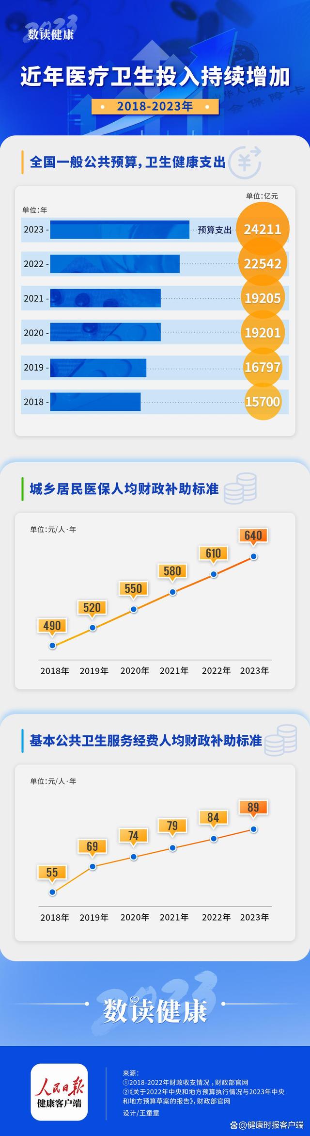 根据3月5日全国人大审议的《关于2022年中央和地方预算执行情况与2023年中央和地方预算草案的报告》,2023年,全国一般公共预算支出安排275130亿元,其中,卫生健康支出占8.8%,达到了24211亿元。这个数据超出了如贵州、内蒙古、甘肃、黑龙江、吉林等省份去年一年的GDP。