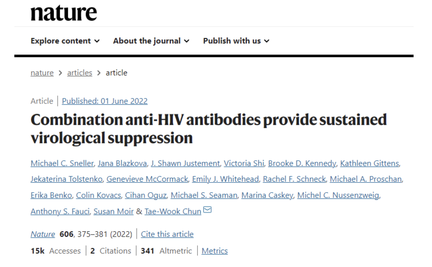 不过,第二种方法在2022年取得了突破。2022年6月,美国国家过敏和传染病研究所的研究团队在《自然》杂志发文称,研究人员通过两种广谱中和单克隆抗体(3BNC117和10-1074)的联合使用,在一项1期临床试验中实现了长期有效抑制HIV的效果。抑制效果最长达到了43周,并且没有产生抗药性。而对照组的所有受试者都经历了停止治疗后体内病毒水平的反弹。此外,实验组的受试者均未出现严重不良反应。
