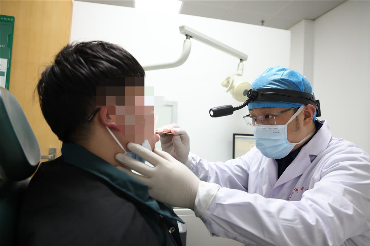 在睡眠医学中心的睡眠呼吸障碍(鼾症)门诊,耳鼻喉科主任陈伟为患者做检查