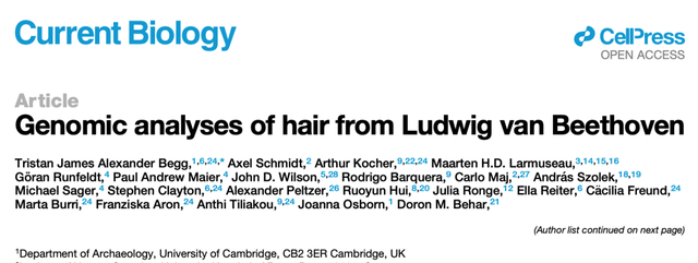 报告称,研究人员从英国、欧洲大陆和美国的公共和私人收藏中获得了8缕头发样本,并对其进行了鉴定测试。研究发现,其中5缕头发样本被确认是真实的,它们来自一个具有贝多芬祖先DNA、且DNA损伤模式也与贝多芬一致的欧洲男性,其中两缕头发被认为是保存最完好的样本。