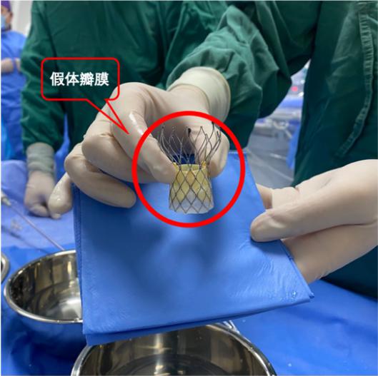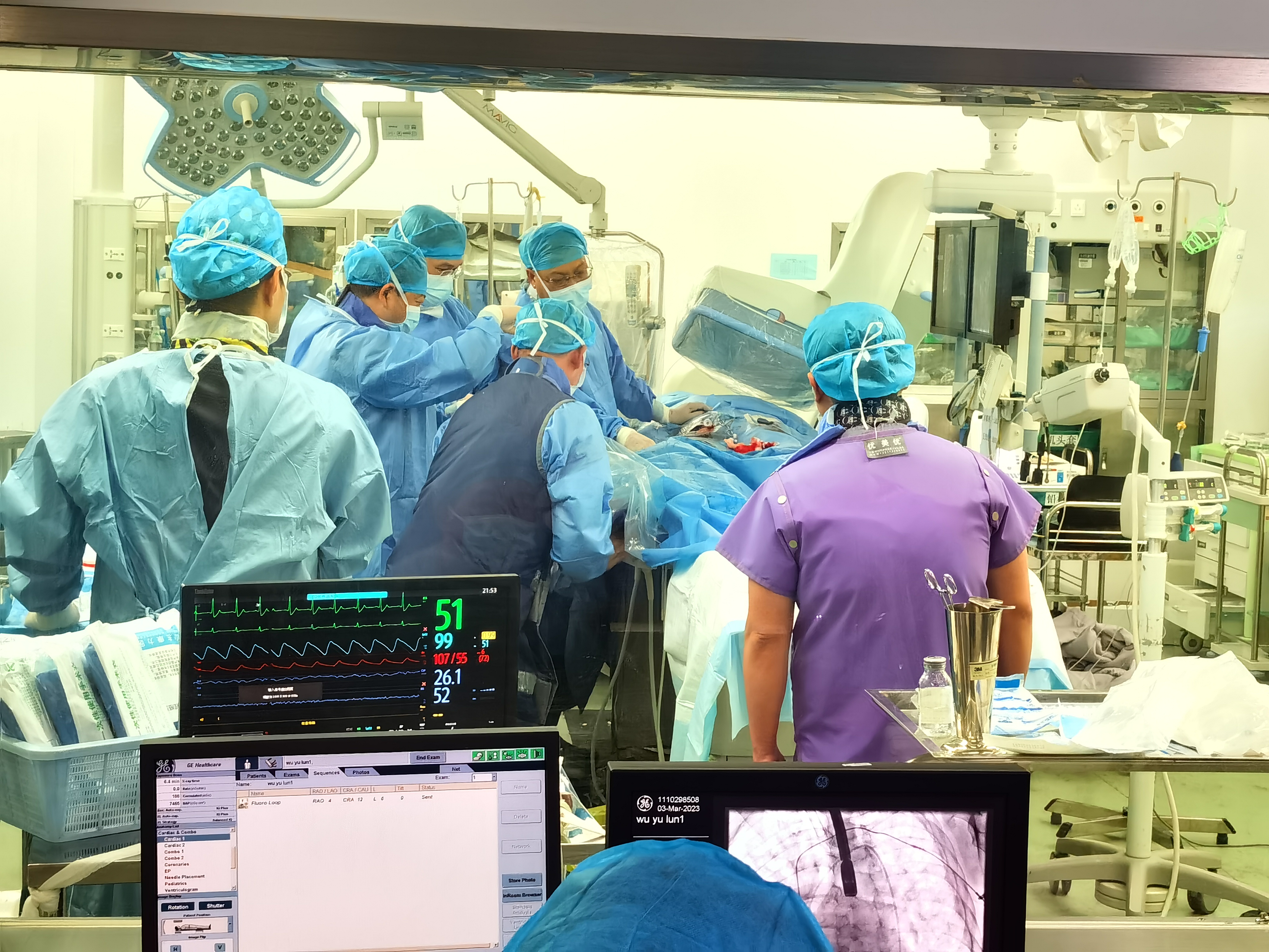 术前,心内科主任尹德录博士带领团队充分评估,制定了周密的诊治计划,并反复模拟。手术当天,尹德录博士和宋和鉴博士,在科内其它骨干的配合下,先对病变的左前降支置入支架,接着将匹配好的人工瓣膜通过右侧股动脉精准置入原病变主动脉处。随后,冠脉支架植入、主动脉窦瘤封堵也顺利完成。