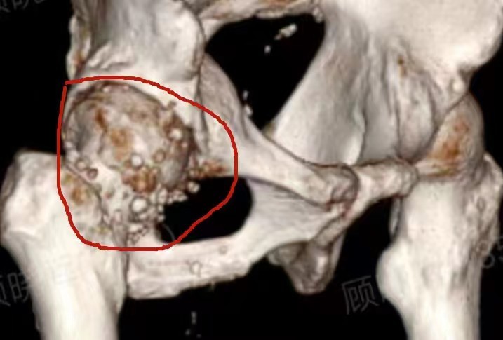 这一查,果然发现新问题,CT显示老沈右髋关节囊内存在多发的骨化游离体影,密密麻麻长了很多小瘤,就像很多小“珍珠”散落在关节囊里。医生认定,老沈不仅患有着腰椎间盘突出,还发现其腰腿痛的另一病因——滑膜软骨瘤病。