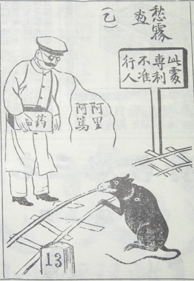 上图中,一条残破的铁路象征着被遮断的交通,路的左边是一位双手抱持西药箱的医官,并且说了一句“阿里阿笃”(ありがとう,谢谢)。由此判断这是一位日本医官。而路的右边是一只站立着的大老鼠,在离铁路不远处树立着一块牌子,上面写着“此处专利,不准行人”。