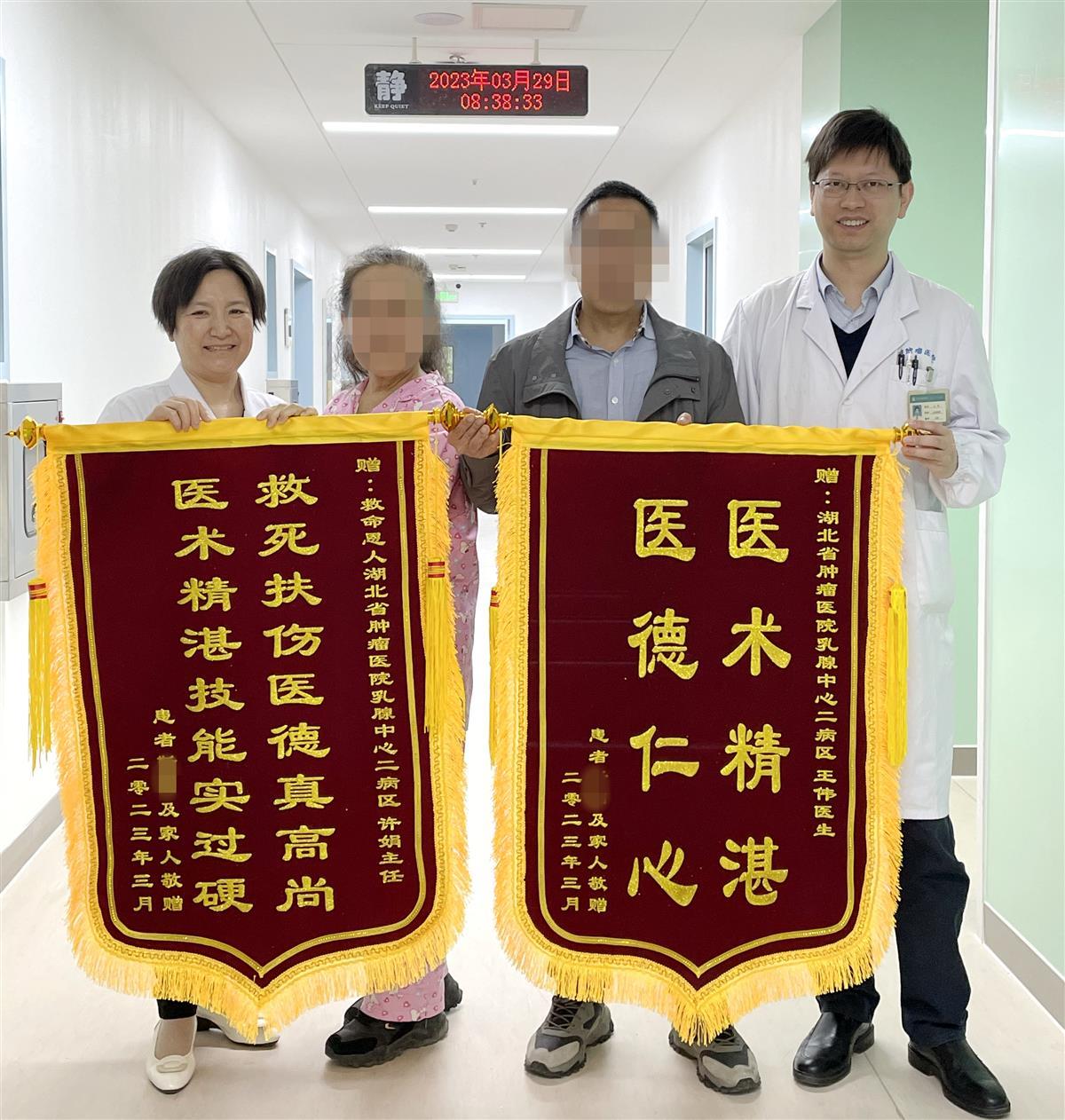 从肿瘤疯长、疼痛难忍、求医无门到快速入院、成功手术、康复出院……57岁的乳腺癌患者金女士(化名)在短短两周内,切身经历了一次绝处逢生。3月29日,她从湖北省肿瘤医院乳腺中心康复出院时,给全力救治自己的主任医师许娟和主治医师王伟赠送了感谢锦旗,并承诺以后一定按时复查。