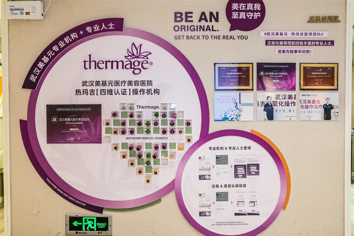 3月27日上午10时许,极目新闻记者来到武汉美基元医疗美容院,进入治疗区,一面Thermage认证墙就映入眼帘。墙上公示了武汉美基元医疗美容院是“2022年度Thermage认证医院”、认证医生的介绍、正品美容头端、验真流程等相关信息。