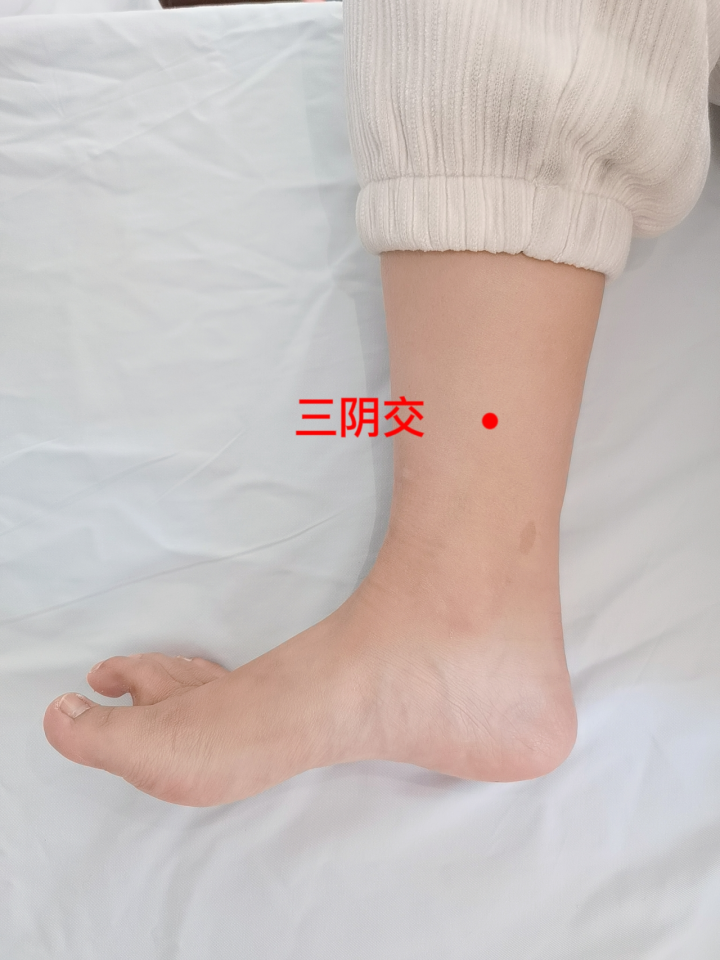 3、三阴交穴:位于小腿内侧,当足内踝尖上3寸,三阴交穴是脾、肾、肝这三条经络相互交汇的重要部位。