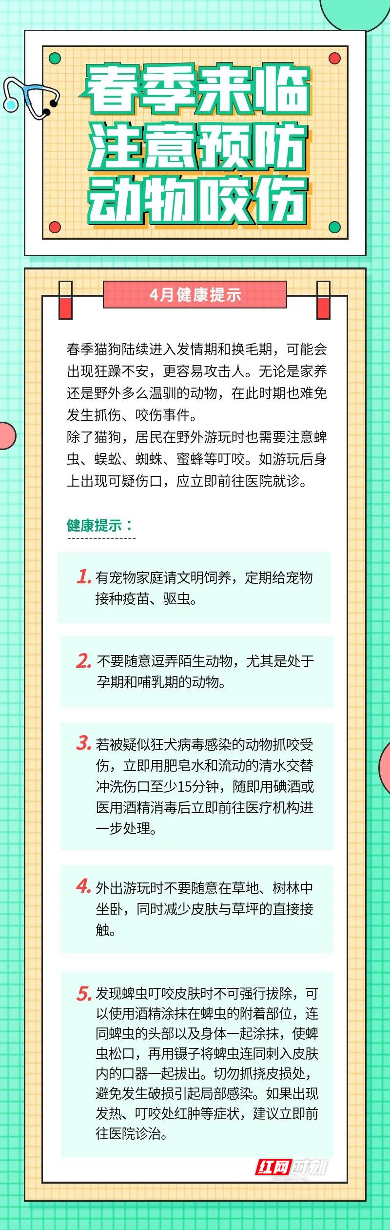 4月12日,湖南省疾控中心发布提示,注意预防动物咬伤。省疾控中心提醒,除了猫狗,居民在野外游玩时也需要注意蜱虫、蜈蚣、蜘蛛、蜜蜂等叮咬。如游玩后身上出现可疑伤口,应立即前往医院就诊——