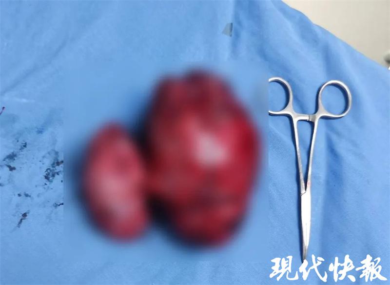 术前,何志贤手术团队反复讨论病情及手术方案,并做好充分的手术预案。术中,麻醉手术科黄红芳主任娴熟的技术顺利气管插管成功取得开门红。何志贤带领张伟、王斐然医生组成的手术团队仔细处理一根根粗大的血管,一点点从颈部拔出深陷胸腔的甲状腺,经过2个小时的努力,成功将巨大的甲状腺肿切除。经测量,完成切除的甲状腺长径足足有15厘米。