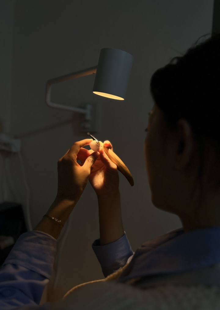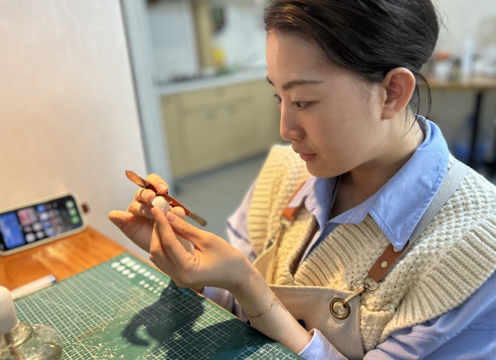 昕瞳正在工作,手中的义眼片经过打磨即可成型。