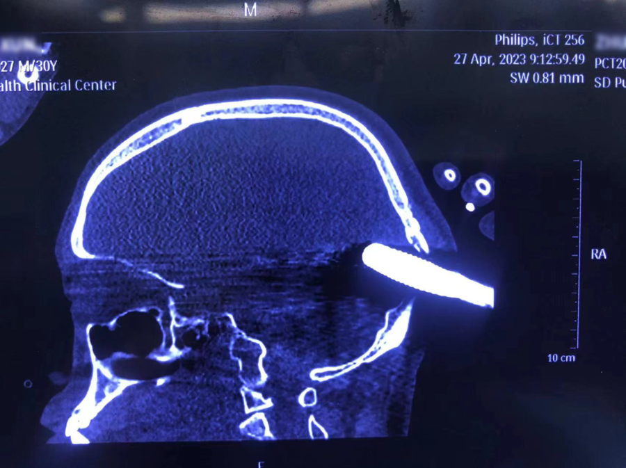 中心开启急救绿色通道,通知神经外科、影像科、检验科等做好急诊接诊准备。考虑患者头部钢筋过长不易固定,无法行颅脑影像检查,紧急联系消防火警协助截断钢筋。患者到达中心后立即转入抢救室,予以建立静脉通路,吸氧、心电监护,抽血化验完善检查,护士协助消防队员将患者钢筋锯断,钢筋残端仅剩20公分。神经外科医师张云一评估患者病情后,立即予以完善颅脑CT检查。