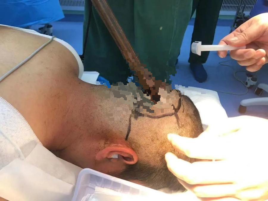 术中可见钢筋贯穿位置颅骨粉碎性骨折,且有暗红色血自骨折缝涌出,考虑钢筋损伤静脉窦。医生将骨瓣用铣刀铣除后,见钢筋突破硬脑膜,脑组织挫伤严重。小心分离硬脑膜和钢筋,保护静脉窦,将钢筋小心取出。清除脑组织内的杂质、坏死的脑组织,修复硬脑膜,手术顺利。