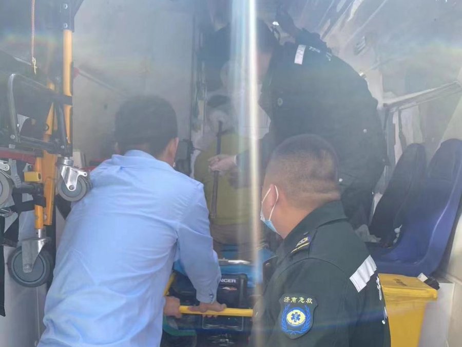 医护人员小心将患者转移至急救车中,将患者转移至山东省公共卫生临床中心蟠龙山院区急救中心。