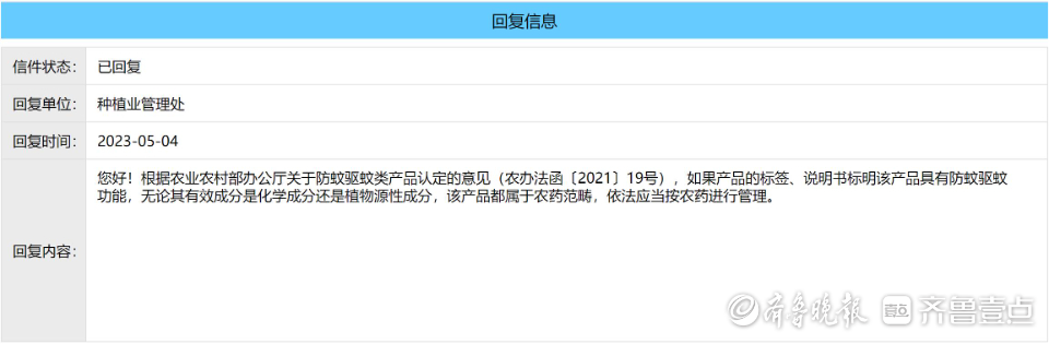 种植业管理处回复到:根据农业农村部办公厅关于防蚊驱蚊类产品认定的意见(农办法函〔2021〕19号),如果产品的标签、说明书标明该产品具有防蚊驱蚊功能,无论其有效成分是化学成分还是植物源性成分,该产品都属于农药范畴,依法应当按农药进行管理。