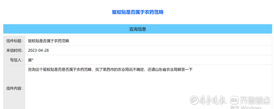 随着天气越来越热,各类蚊虫也开始活跃起来,驱蚊花露水、蚊香、防蚊贴、驱蚊手环等产品进入了热销期。近日,有网友在山东省农业农村厅网站“互动交流”板块咨询留言:驱蚊贴是否属于农药范畴?