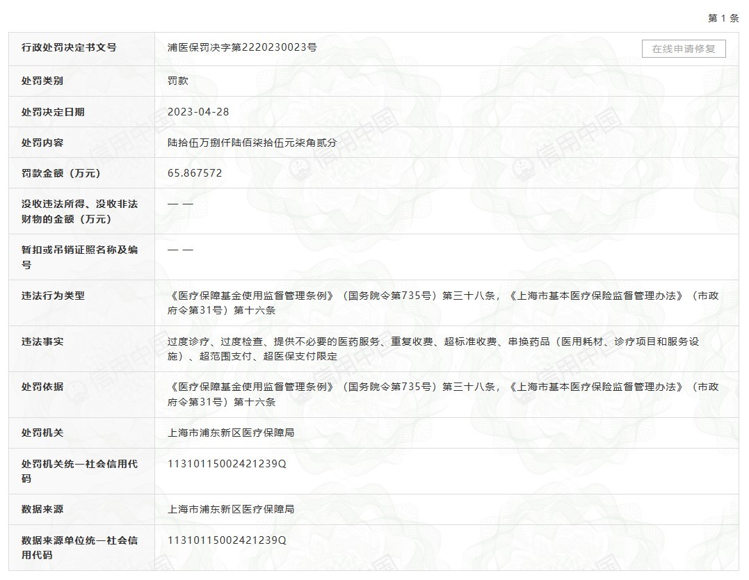 此外,信用中国还显示,上海安达医院2022年便有因重复收费、超医保限定支付等情况被上海市浦东新区医疗保障局行政处罚的情况。