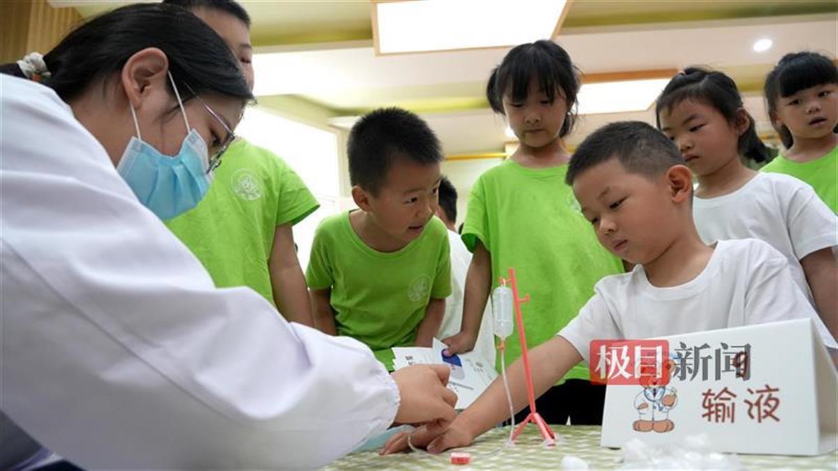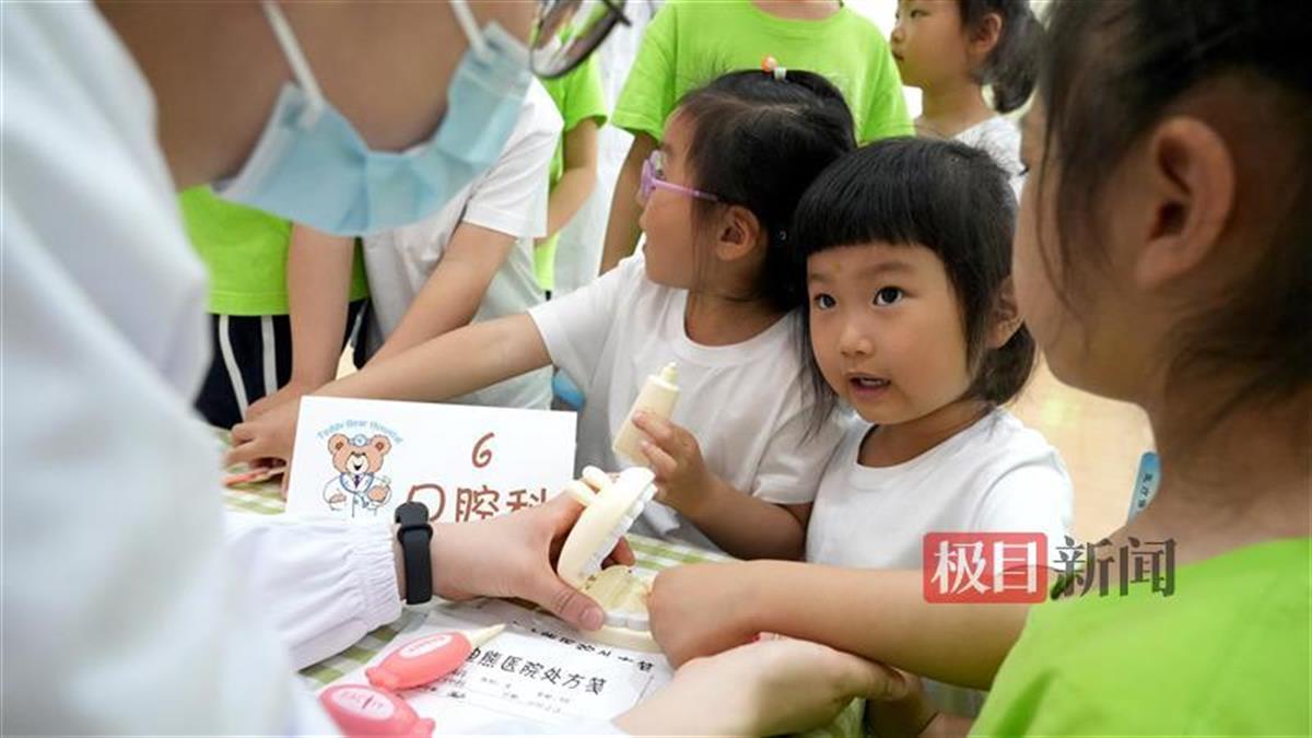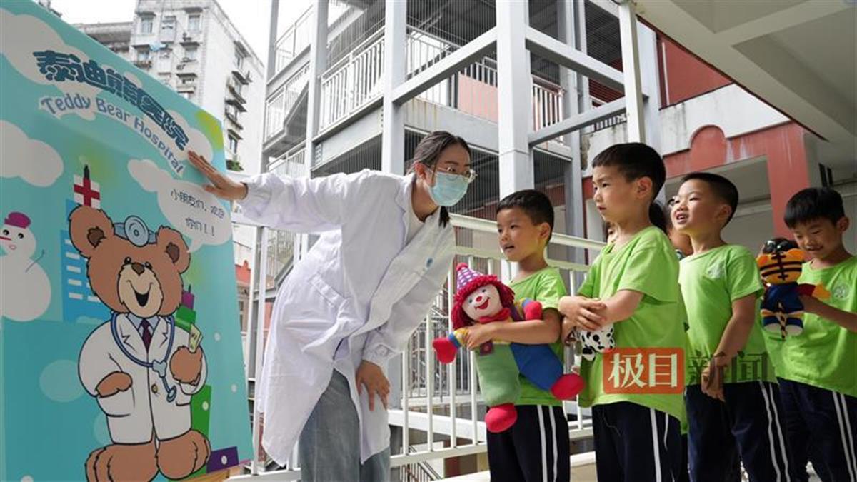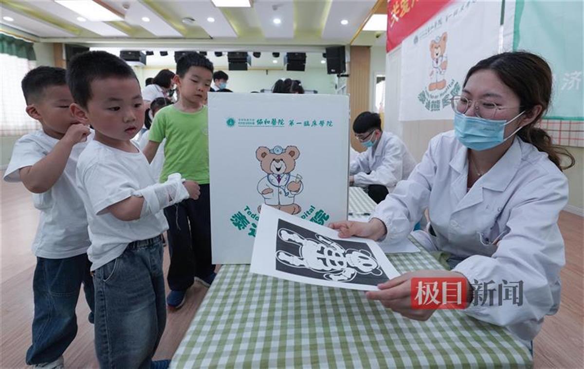 5月5日,在同济医学院幼儿园,200多位小朋友玩起角色扮演,和华中科技大学第一临床学院的学生们一起,在萌萌的“泰迪熊医院”沉浸式体验看病、检查、治疗全流程。