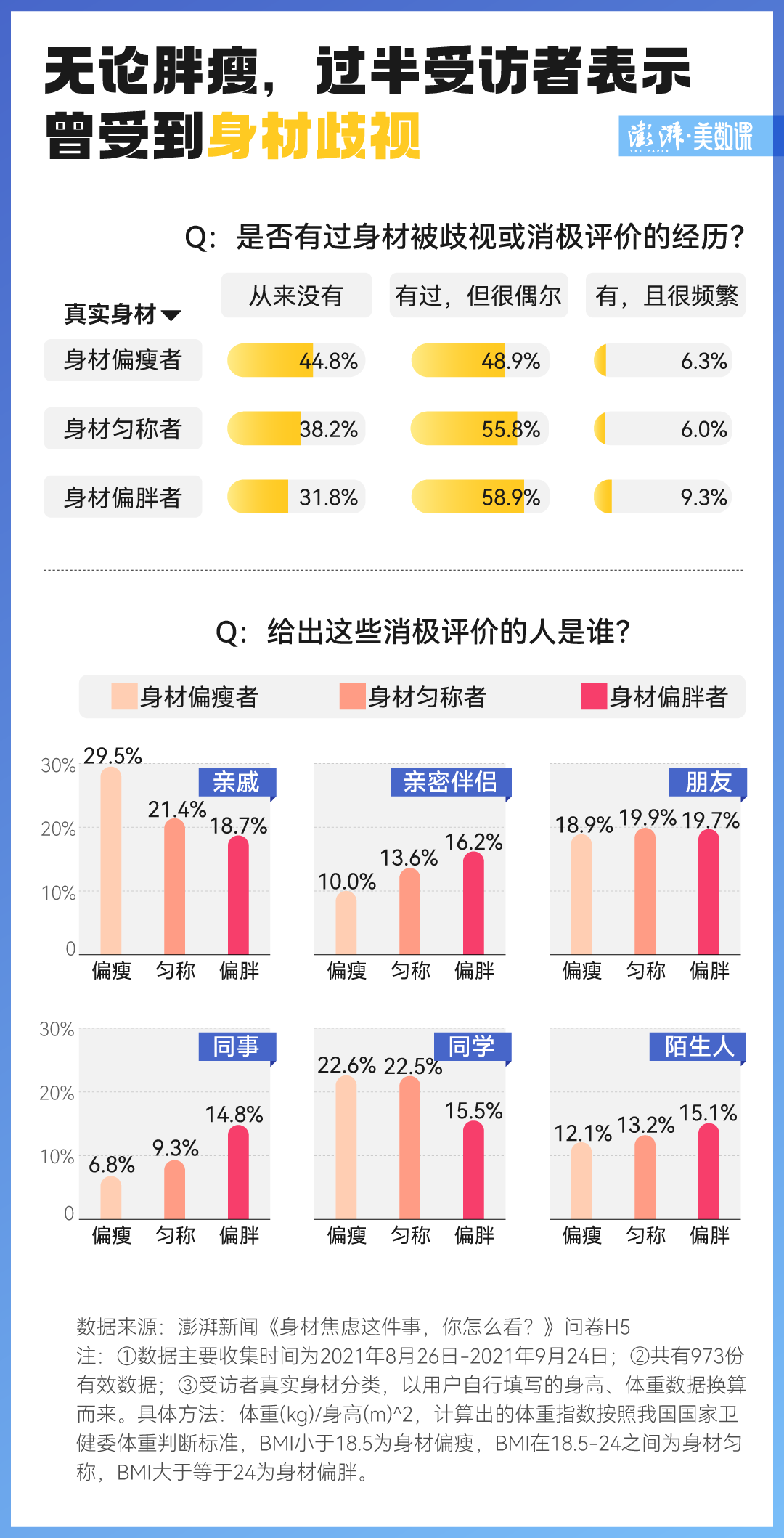 偏瘦的人更容易受到亲戚的“关怀”,而偏胖的人不仅会更多遭遇的亲密伴侣的身材羞辱,还要承受更多陌生人的身材挑刺。
